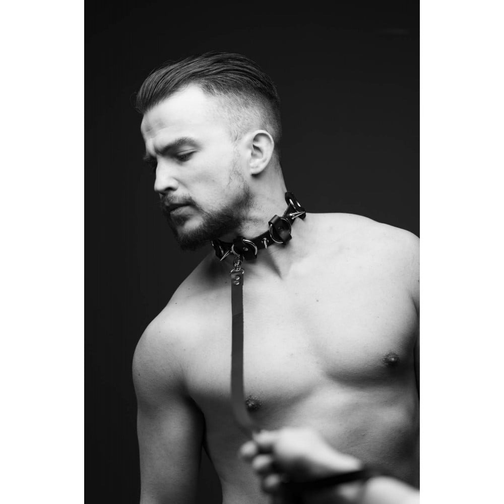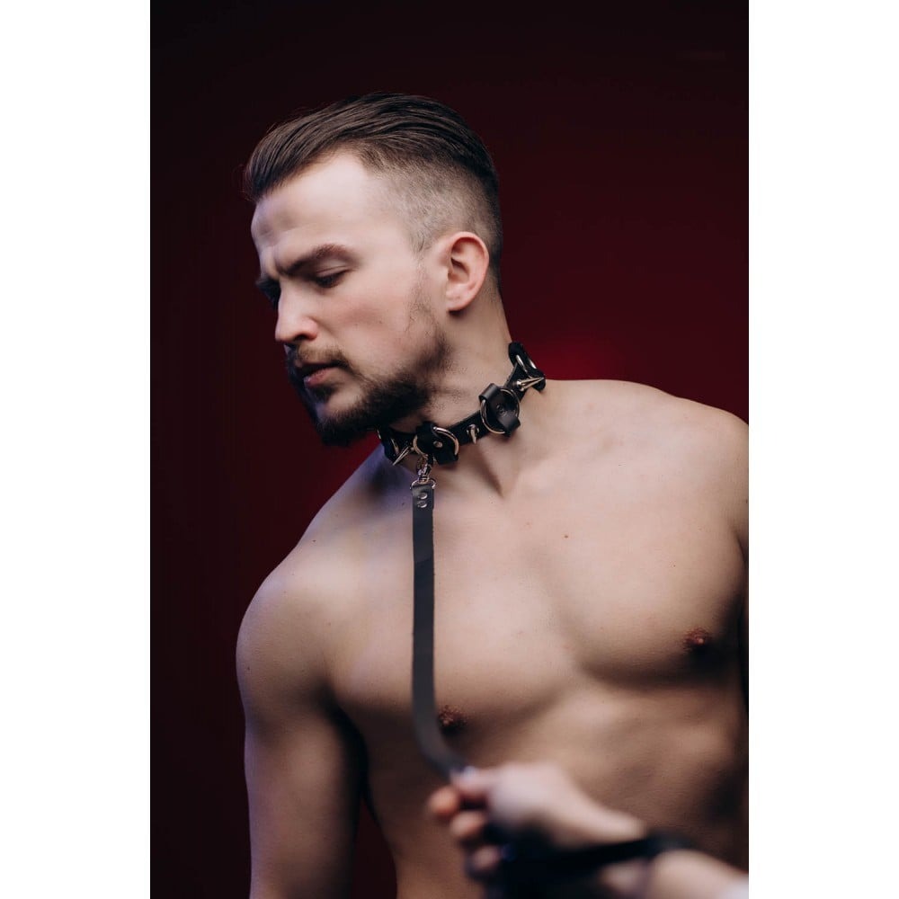 Нашийник чоловічий з кільцями та шипами та повідцем БДСМ натуральна шкіра чорного кольору Candy Hero модель M Ch3 1