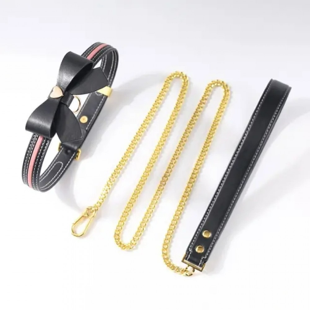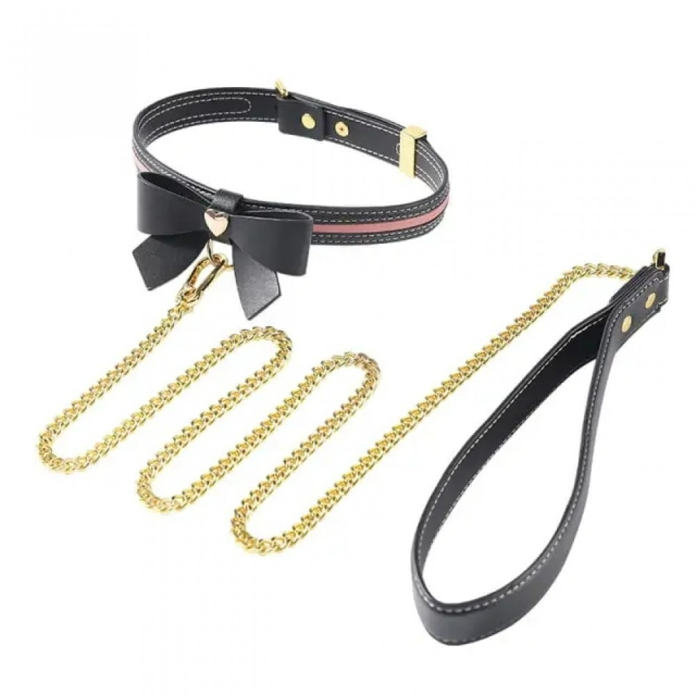 Нашийник з бантиком та повідцем БДСМ з натуральної шкіри чорного кольору Lockink Sevanda