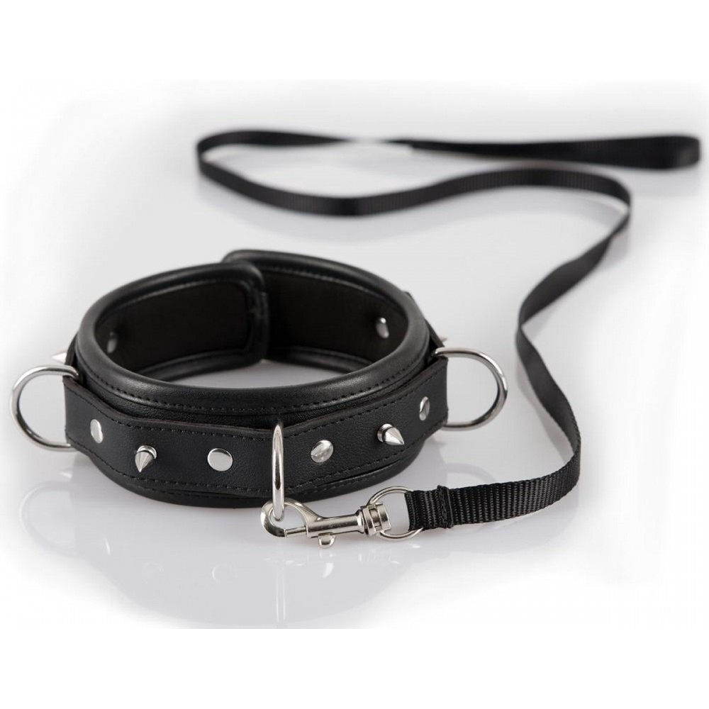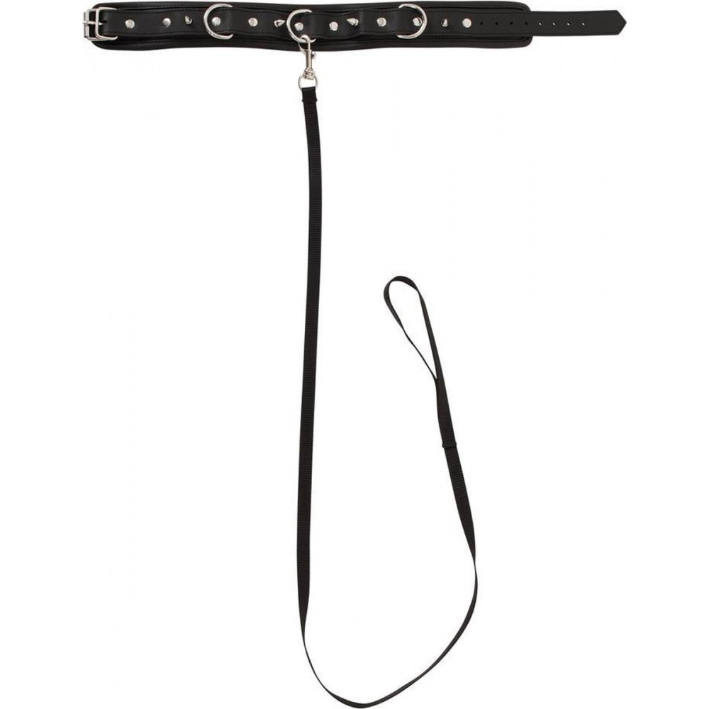 Одягнений на повідець! Регульований шийний браслет з м'якою підкладкою зі штучної шкіри. З декоративними шипами та 3D-подібними кільцями. Поводок, що входить в комплект, знімний. Шийний браслет довжиною 37-47 см, повідець завдовжки 112 см.