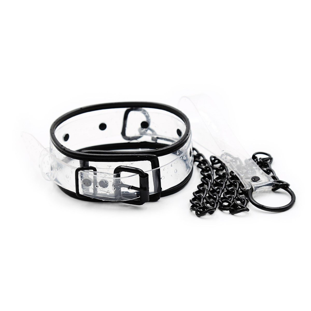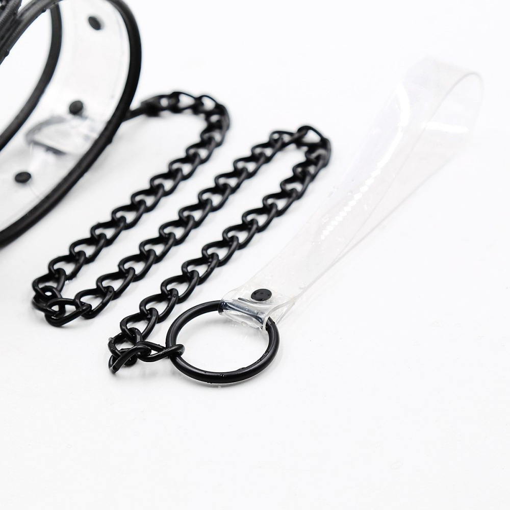 З цим нашийником ви зможете відкрити для себе сильні, безпечні та захоплюючі ігри в рабство. З цим зручним та міцним нашийником з повідцем у вас є повний контроль! Виготовлений із стильного прозорого ПВХ та чорного алюмінію, ремінь має довжину 58 см.