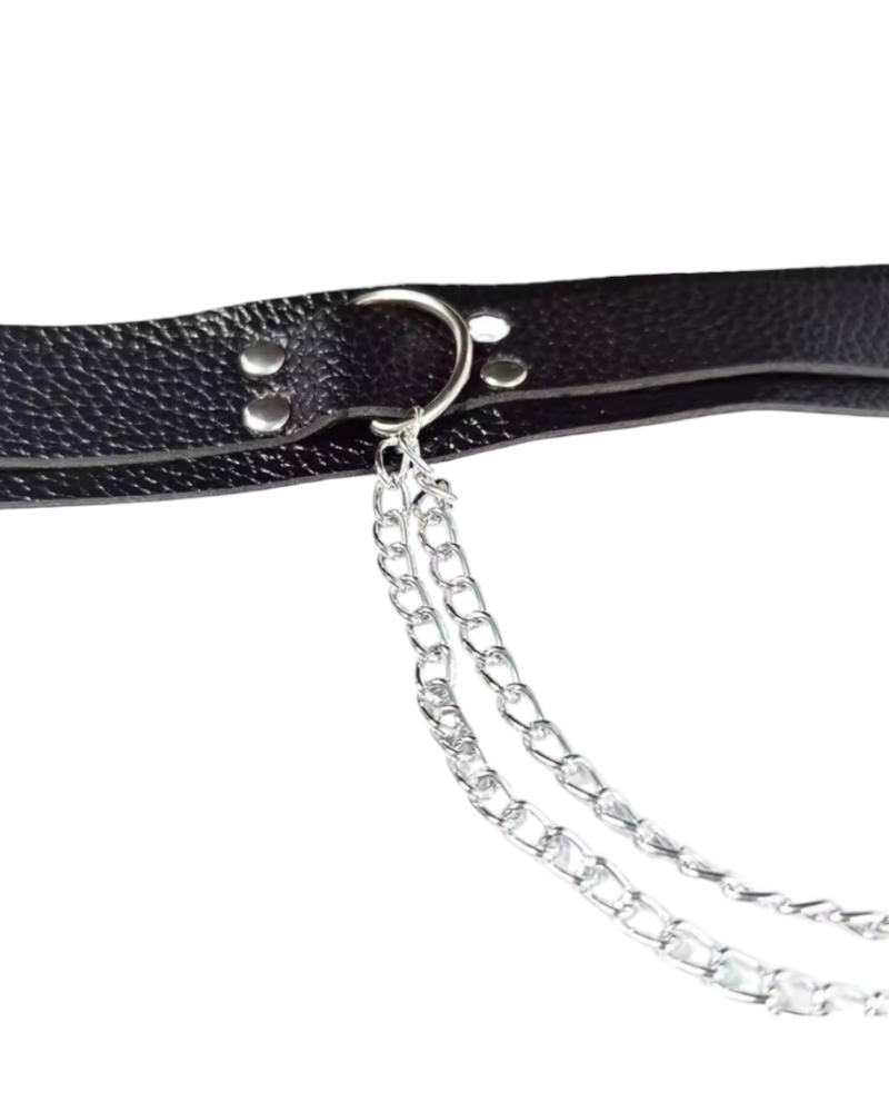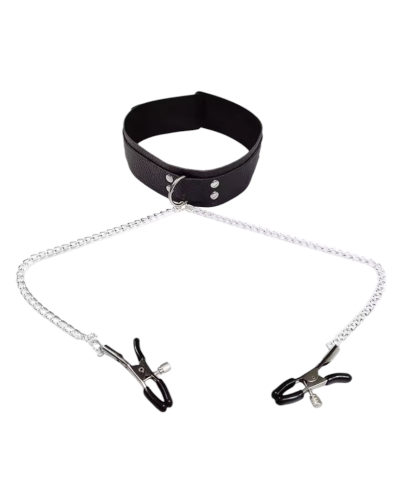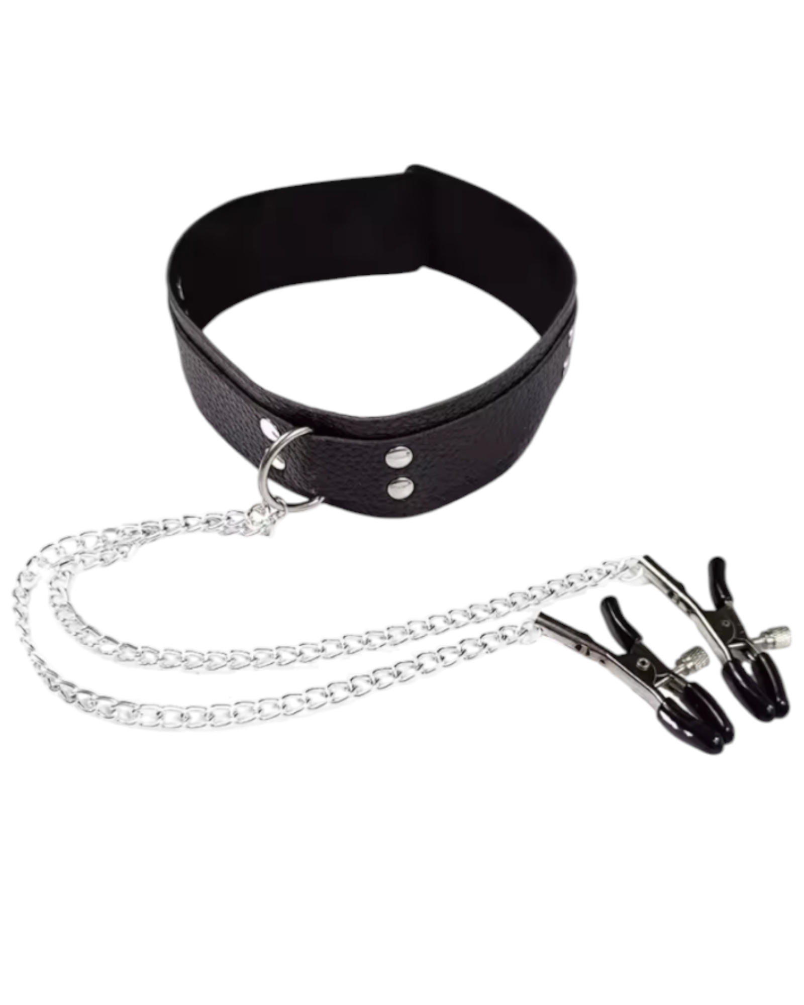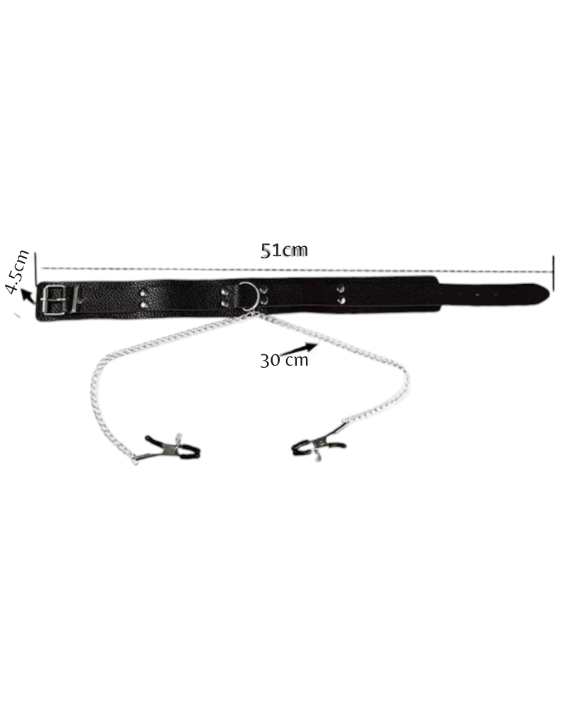 Сексуальне підпорядкування, у якому партнери отримують справжнє задоволення від БДСМ гри. М'який нашийник легко зафіксувати на потрібний об'єм шиї, він не доставляє дискомфорту і виконаний з приємного на дотик шкірозамінника. Металеві затискачі на ланцюжках не тільки стануть окрасою для грудей, та й додадуть гостроти в гру. Затискачі з силіконовими наконечниками дозволяють відрегулювати силу затискання, а повідець служить для сексуальних відсікань партнера, що підкоряється. Насолода від болю-для справжніх профі у світі БДСМ! Комплектація: Повідець, нашийник із затискачами Довжина нашийника: 51 см Ширина нашийника: 4.5 см Довжина ланцюжків: 30см Матеріал: штучна шкіра