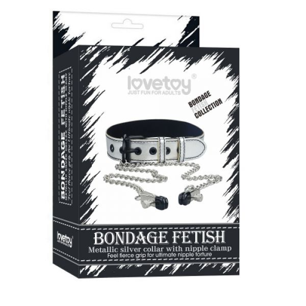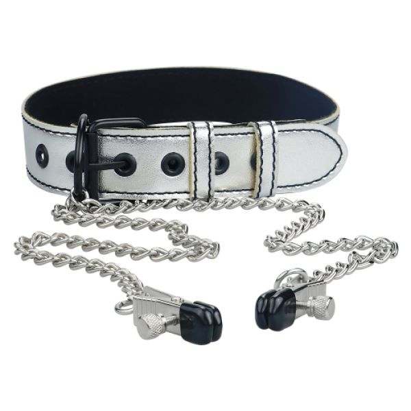 Нашийник БДСМ із затискачами для сосків сріблястого кольору Lovetoy