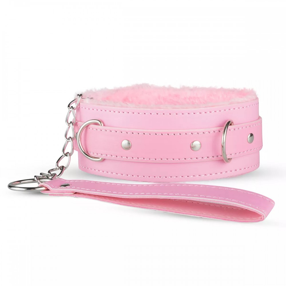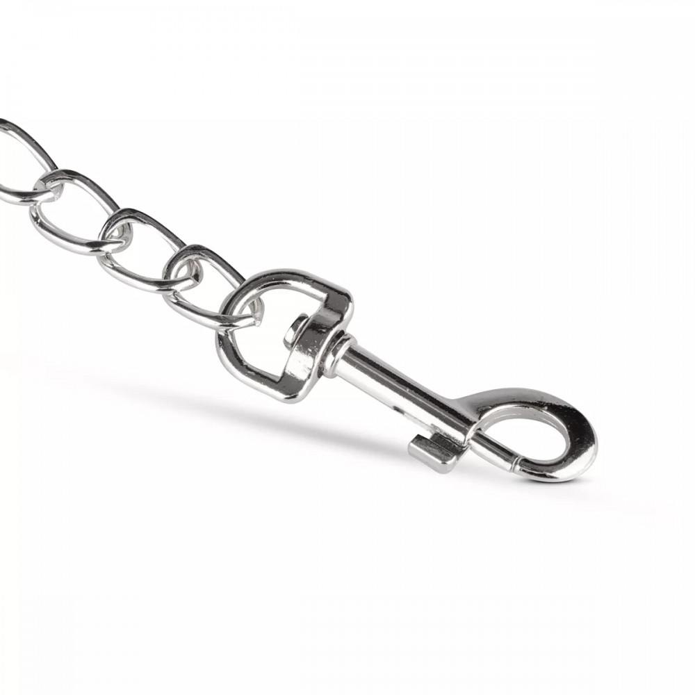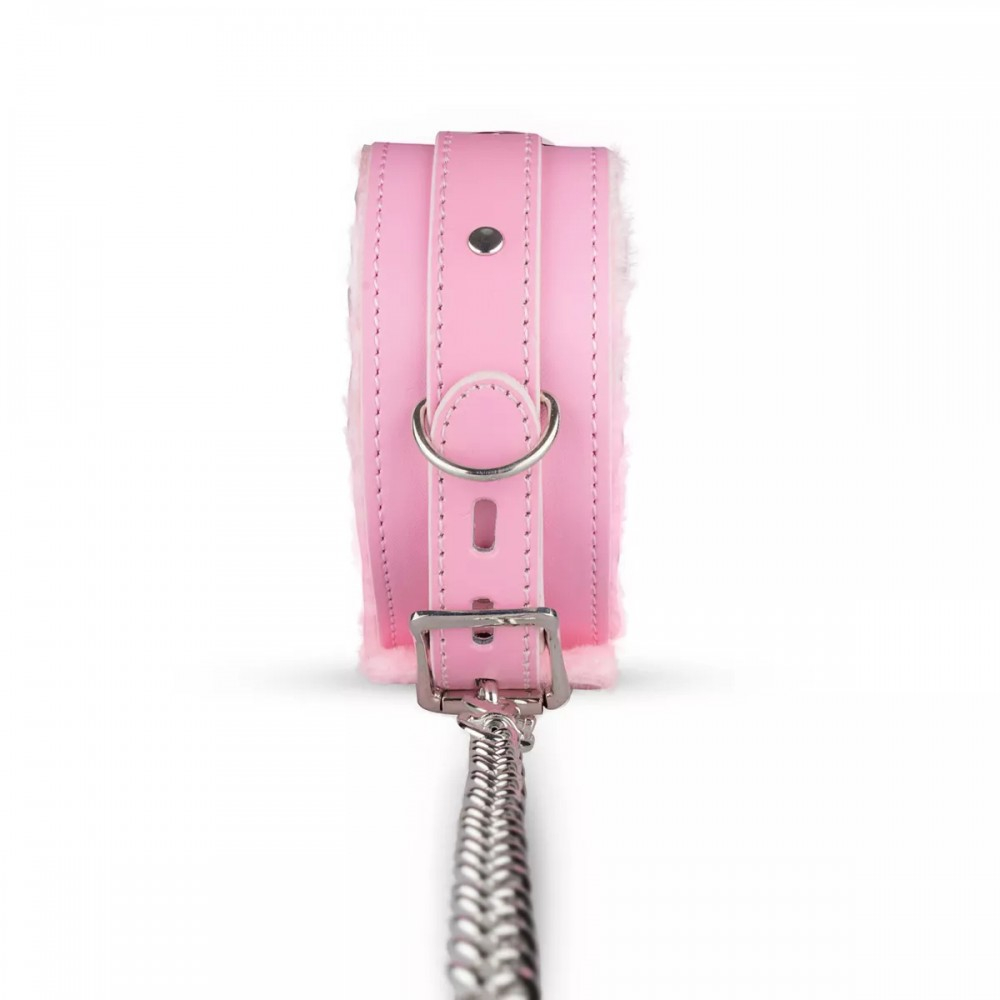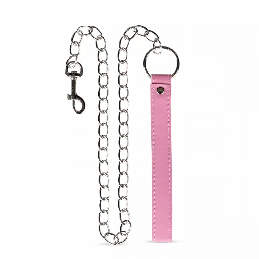 Повідець має сріблястий ланцюжок, колір фурнітури нашийника, і рожеву петлю, яка також знадобиться вам у пристрасній грі.