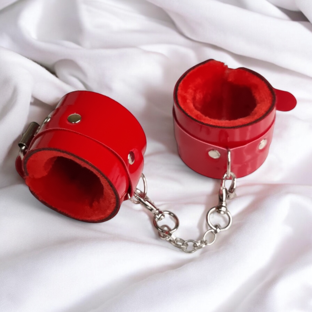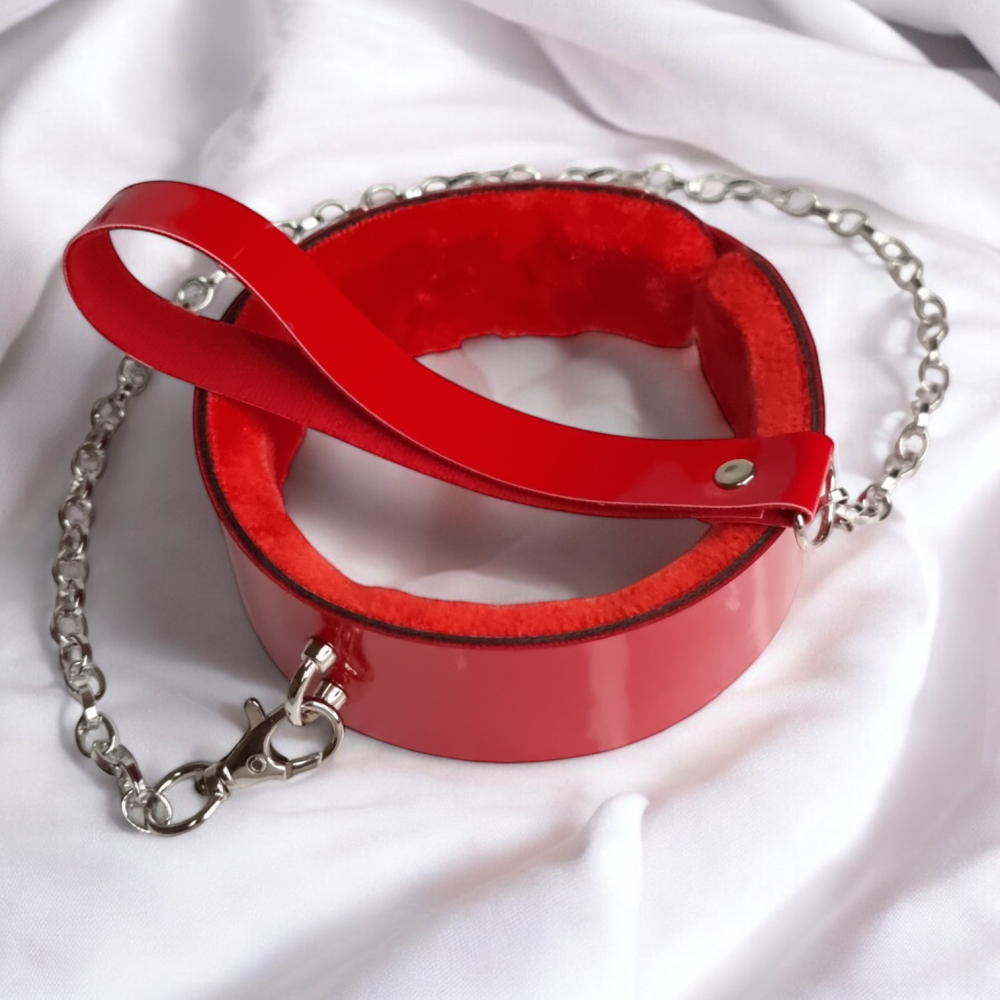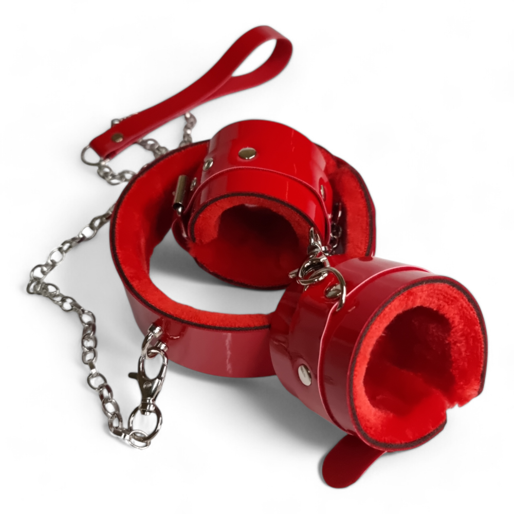 Подарунковий набір для фіксації наручники та нашийник з повідцем з еко лаку червоного кольору Flirty Collection