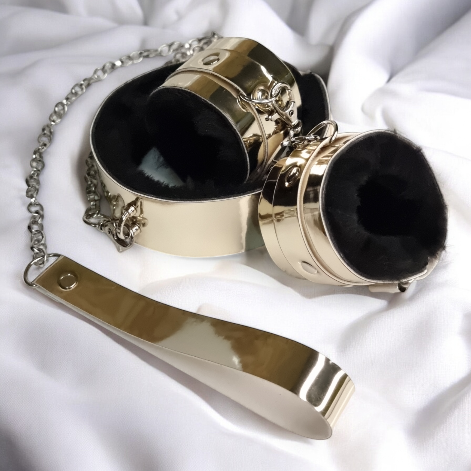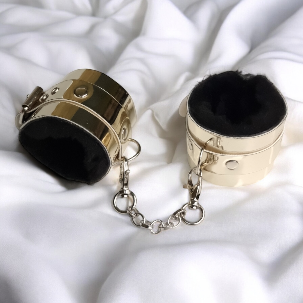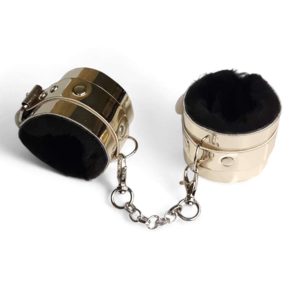 Комплект золоті наручники + нашийник з повідцем з чорним хутром з еко лаком Flirty Цей комплект, виготовлений із преміальної еко шкіри та прикрашений деталями з нержавіючої сталі, є ідеальним вибором для тих, хто цінує високу якість та унікальний стиль. Продуманий дизайн та увага до деталей роблять його не тільки практичним аксесуаром, а й вишуканим доповненням до вашого образу. Нашийник і наручники є символом підпорядкування в БДСМ-сексі, проте за допомогою комплекту фіксаторів ви зможете продемонструвати партнеру свою зухвалість і норовливість навіть у ролі сабмесива. Обидва фіксатори регулюються ремінцями та пряжками, тому ви легко зможете підібрати необхідний розмір залежно від обхватів зап'ястя та шиї. На нашийнику передбачено кільце по центру за допомогою карабінів, ви можете закріпити повідець із комплекту. Універсальний аксесуар спеціально для любителів домінування та підпорядкування, а також обмеження рухів під час еротичних розваг.
