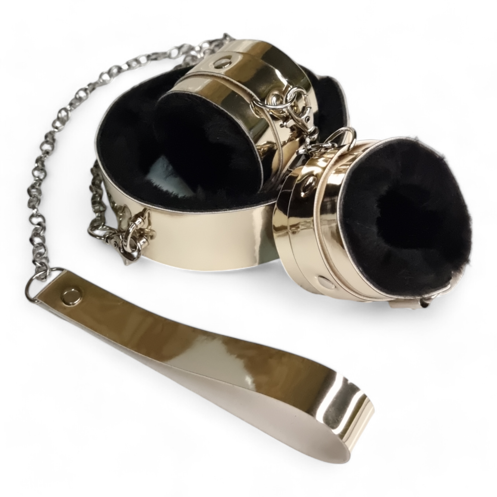 Подарунковий набір для фіксації наручники та нашийник з повідцем з еко лаку золотистого кольору Flirty Collection