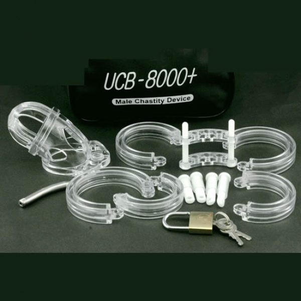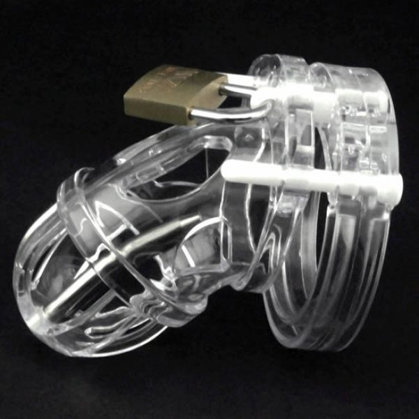 Пояс вірності прозорого кольору з мідним замком. Діаметр трубки з нержавіючої сталі для уретри 0,7 см., Довжина клітини 5 см., діаметр 3,5 см., 5 кілець різного діаметру: 3,8 см., 4,1 см., 4,4 см., 4,7 см., 5,1 см. Довжина для пеніса 4,2 см., Вага 130 грам.