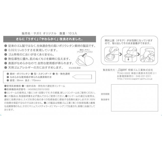 Презервативи Sagami Original 0.02 (2-го покоління) мають товщину всього 0,02 мм і не містять латексу. Ці презервативи виготовлені з поліуретану (PU) і тому також підходять для людей з алергією на латекс.