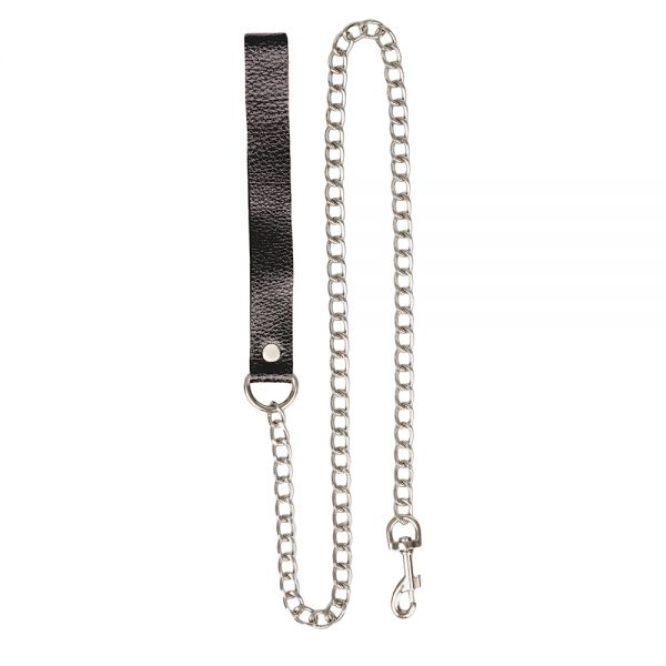 Універсальний довгий повідець. Виготовлений з міцного нікелю і натуральної шкіри чорного кольору. Може бути скомбінований з безліччю аксесуарів за рахунок карабіна. Петля зручно лежить в руці, не ковзає і не натирає. Повідець є невід'ємним аксесуаром для ігор з домінуванням. Повна довжина 93 см, ланцюжок 69 см, карабін 6 см