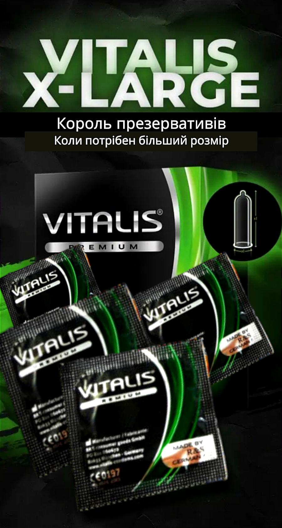 Vitalis X-large є презервативом більшого розміру з прямими сторонами з натурального каучукового латексу з мастилом на кінці резервуара. Презервативи більше, ніж презервативи звичайного розміру, зі збільшеною довжиною та шириною для більшого комфорту. Король презервативів! VITALIS пропонує презервативи вищої якості, виготовлені з унікального високоефективного з'єднання на основі латексу. Всі презервативи Vitalis сертифіковані CE, пройшли електронне тестування та є 100% справжніми.