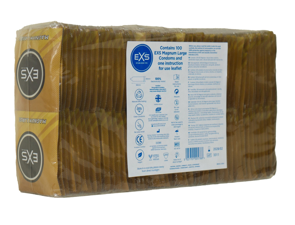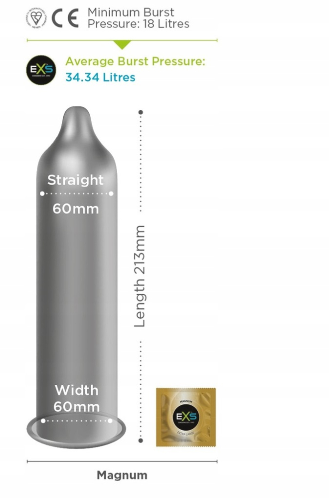Презервативи EXS Magnum Extra Large призначені для того, щоб забезпечити чоловікові з великим членом максимальний комфорт у сексі, залишаючись у безпеці. EXS Magnum для вас! Він має ширину цілі 60 мм, прямі стіни та резервуар для більшого комфорту. Презервативи EXS Magnum виготовлені з тонкого, але міцного шовковистого латексу. Кришталево прозорий дизайн EXS Magnum Condoms дозволяє їм виглядати більш реалістично, щоб ви і ваш партнер могли зосередитися на задоволенні, в той час як високоякісний натуральний латекс дасть реалістичні відчуття і не здавлюватиме член. Довжина 213 мм. Ширина 60 мм.