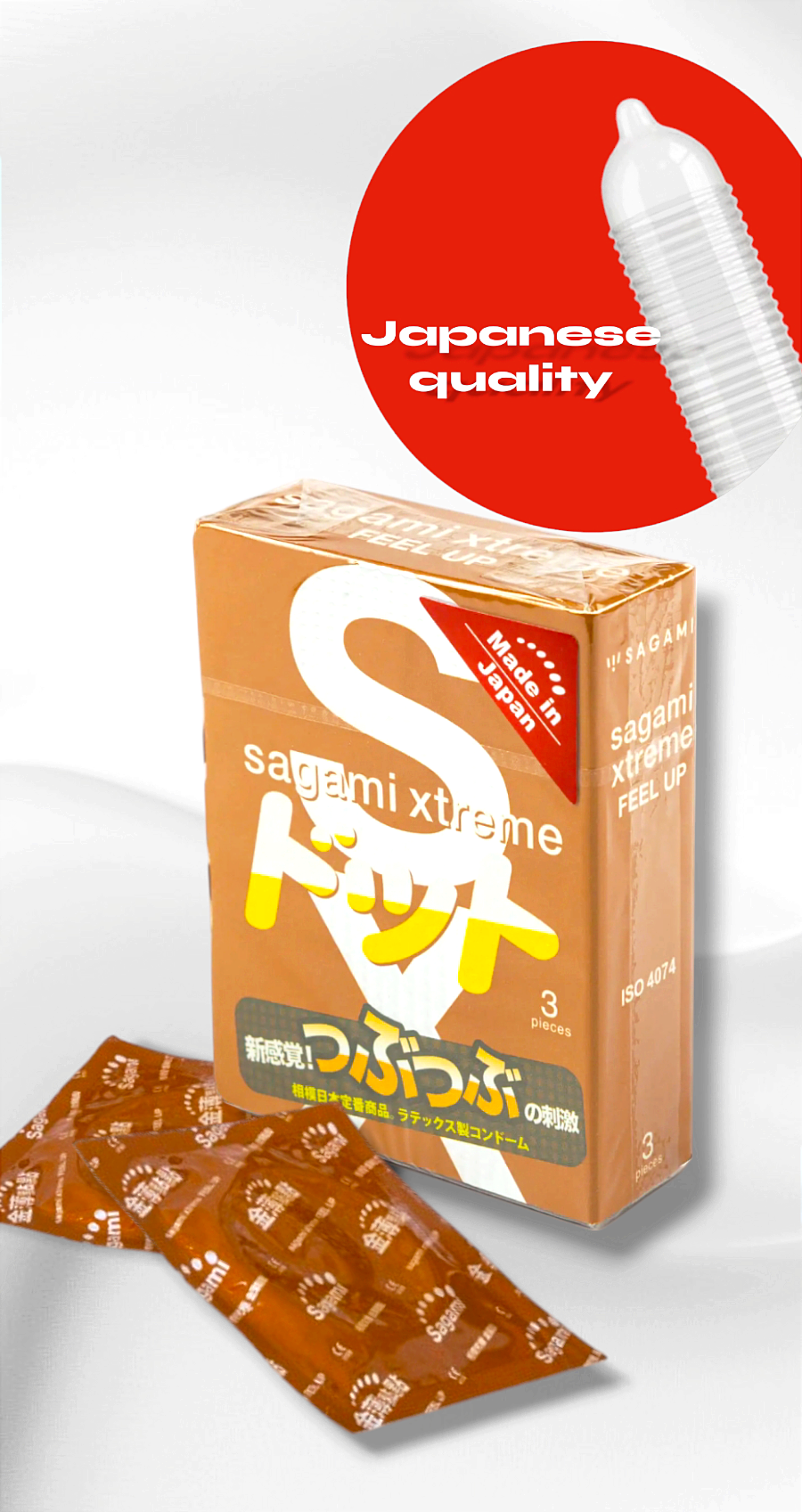 Презервативи Sagami Xtreme Dots Type Feel Up (3шт) з натурального латексу з рельєфною точковою текстурою, накопичувачем та мастилом, що не містить сперміцидів. Унікальна щільна рельєфна текстура забезпечить Вашому партнеру незвичайне задоволення та додаткове навантаження на найчутливіші зони. Міцна ребриста текстура і анатомічна форма, що щільно облягає, забезпечують додаткове навантаження на найбільш чутливі зони чоловіка. Задоволення обох партнерів. Виготовлено у Японії з високоякісного латексу преміум класу. Задоволення та безпека абсолютно нового рівня. Лубрикант на основі силіконової олії з накопичувачем