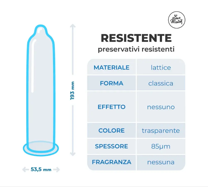 Love Match Resistente – презервативи підвищеної надійності для анального сексу. Це презервативи зі стандартними характеристиками, але більшої товщини. Презервативи Resistant Love Match товщі за класичні і містять більше мастила, тому вони чудово підходять для анального сексу. Оптимальний розмір накопичувача та самого презервативу роблять його універсальним для всіх користувачів. Презервативи Love Match виготовлені з натурального латексу, прозорі, високої еластичності та міцності, гарантують максимальну безпеку при використанні. Ціна вказана за 1 презерватив.