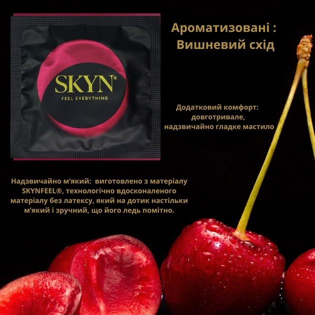 Характеристики Презервативи ультратонкі безлатексні з поліізопрену з ароматом та смаком вишні Skyn Cocktail Club Cherry Sunrise 12 штук без упаковки