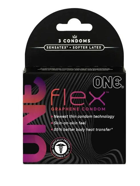 Під час клінічного випробування користувачі надавали перевагу презервативам ONE® Flex™ 2 до 1 перед стандартними латексними презервативами. Безпечний для організму, підходить для веганів та не містить ГМО. Без парабенів, глютена, барвників та ароматизаторів. Дозволено до продажу FDA та тричі протестовано на безпеку. Графен на основі вуглецю надає презервативам ONE® Flex™ фірмового, вугільного відтінку, неймовірної еластичності та комфортної посадки для покращення відчуття.