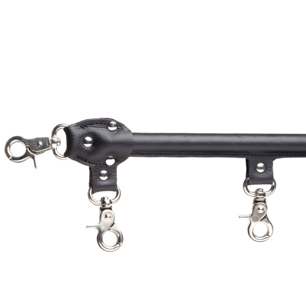 Міцна розпірка обтягнута шкірою теляти і прикрашена фурнітурою сріблястого кольору, яка ще більше підкреслює красу і унікальність даного девайса. Закручуються карабіни, закріплені на кінцях щільними стібками, можна використовувати разом з наручниками та манжетами для кісточок для закріплення.