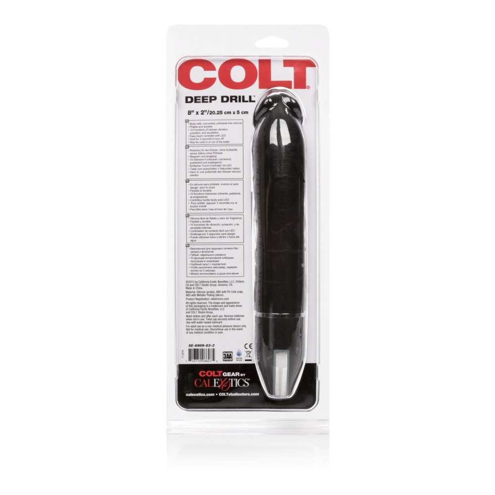Colt Deep Drill – зонд з реалістичними характеристиками. Відрізняється гнучким стрижнем із неймовірним обхватом. Включає 10 потужних функцій вібрації, пульсації та ескалації. Зручне кнопкове керування зі світлодіодним підсвічуванням. Зонд виготовлений із силікону. Кришка виготовлена з АБС-пластику з поліуретановим покриттям та срібним покриттям. Потрібні 3 батареї АА (не входять в комплект).