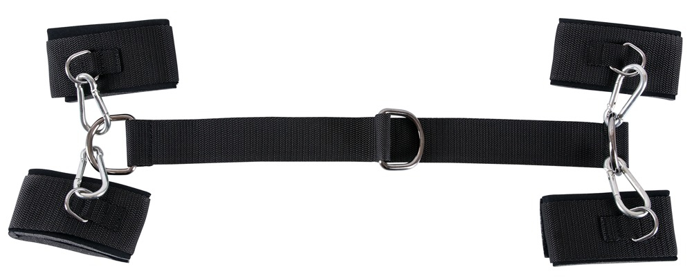 Система фіксації зробить вашого партнера безпорадним! Цей набір м'яких наручників і манжет на щиколотках можна носити спереду, коли сидить партнер, або ззаду, коли він стоїть. Обмежувачі також можна приєднати до кільця в середині сполучного ременя завдовжки 43 см для тих, хто любить трохи більше різноманітності. Манжети мають застібки-липучки.