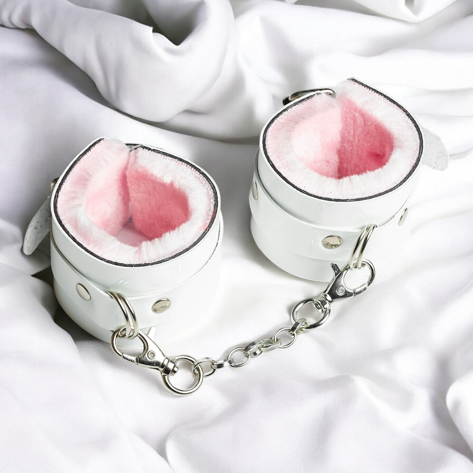 Характеристики Розкішні наручники БДСМ із штучної шкіри білого кольору з рожевим хутром Flirty