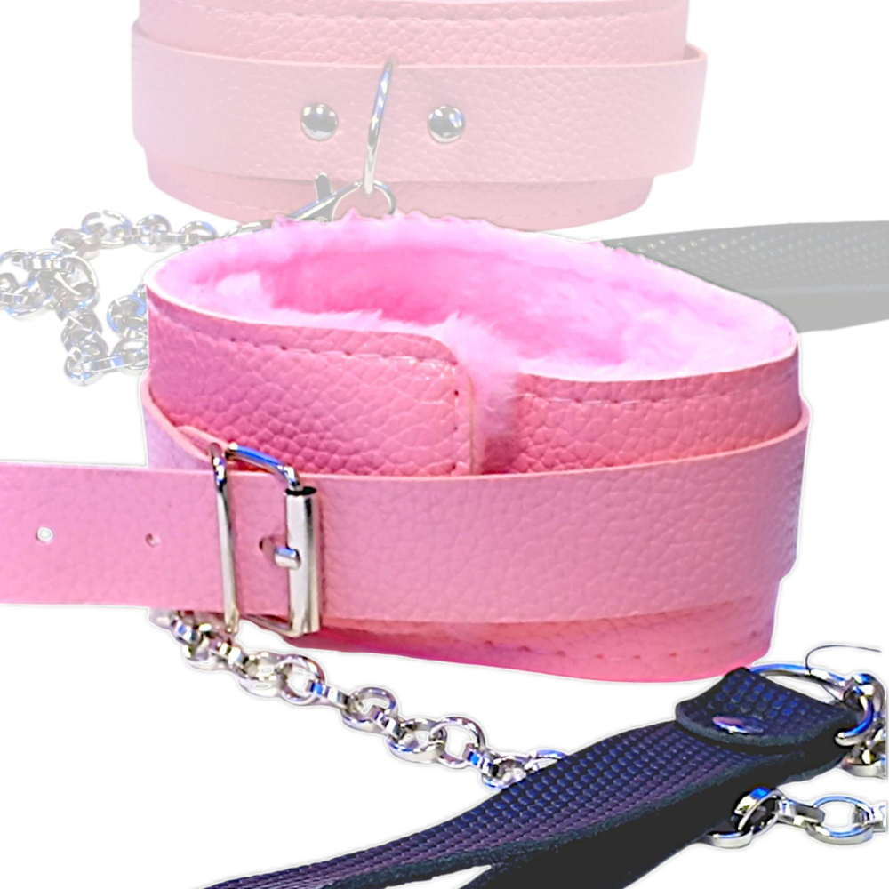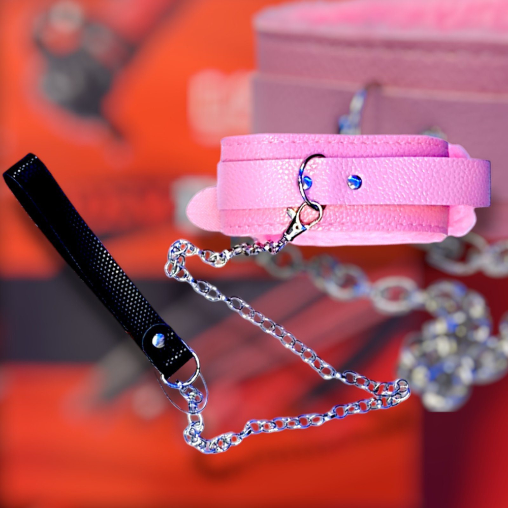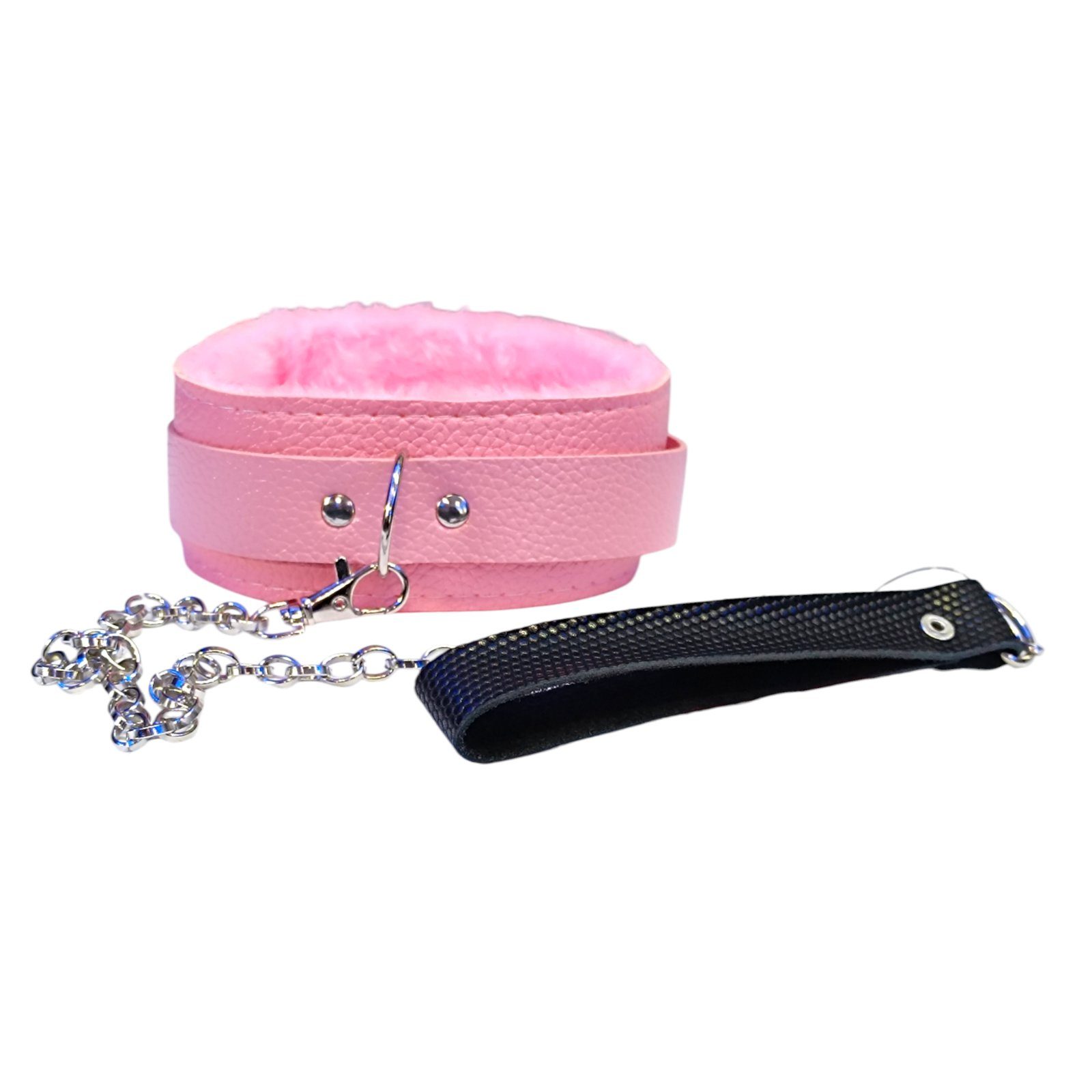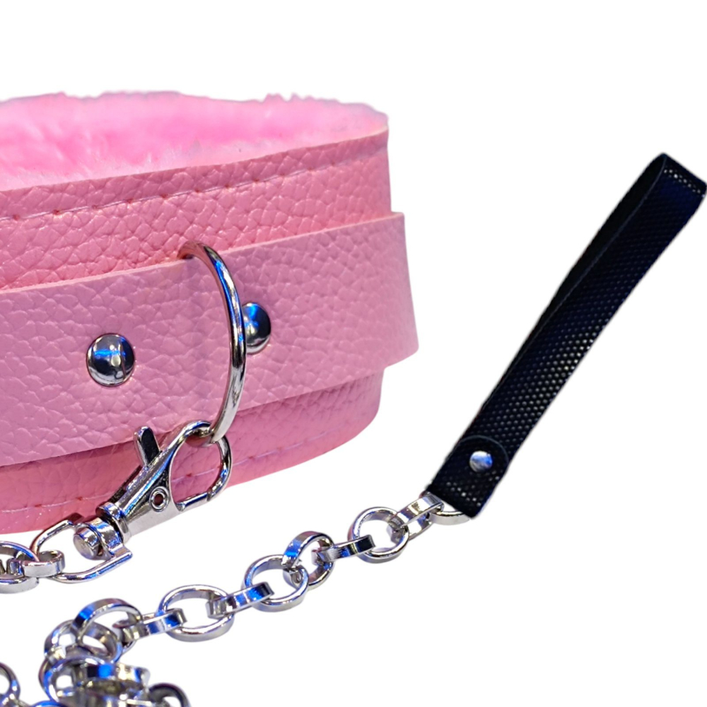 Рожевий м'який нашийник з ланцюжком повідцем та чорним тримачем зі штучної шкіри Easy Life BDSM Desire Love leash