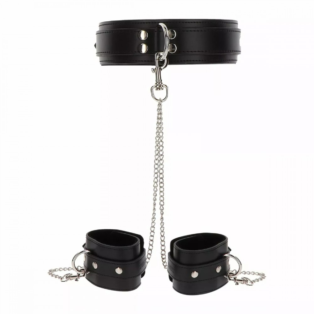 Нашийник широкий з повідцем ланцюжком БДСМ з наручниками чорного кольору Taboom