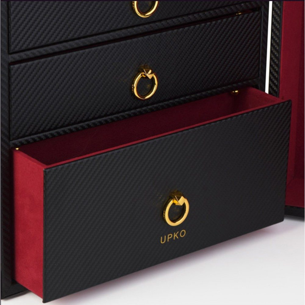 Валіза від Upko, як і його минула версія, має металеві гачки та ремінці на липучках усередині, але в цій валізі додалося ще дві висувні скриньки, для різноманітних дрібних аксесуарів (затискачі для сосків, пробки анальні, міні-вібратори).