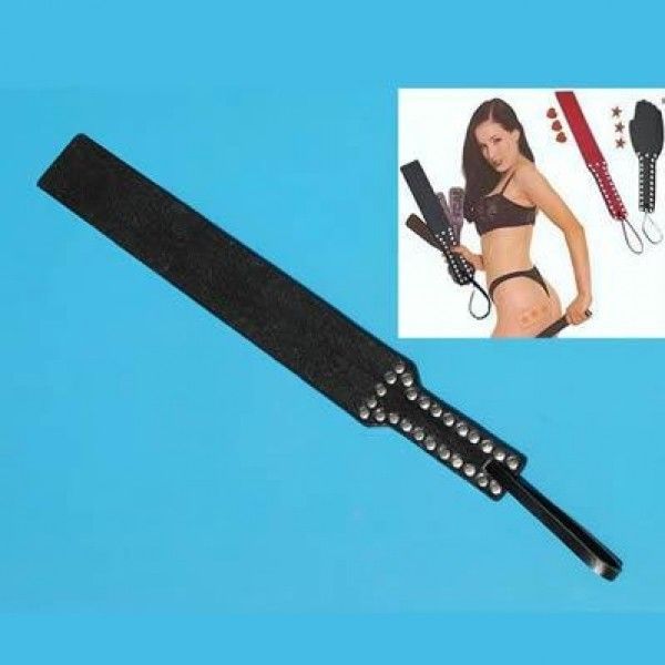 Чорна шлепалка з натуральної шкіри у формі весла. Прикрашена безліччю металевих заклепок. Ручка для підвіски.