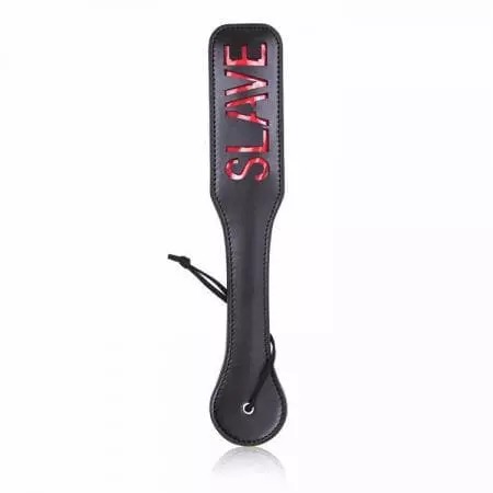 Шльопля овальна БДСМ чорного кольору з червоним написом Slave DS Fetish довжина 320 мм