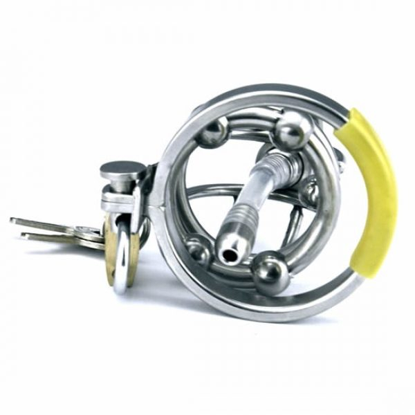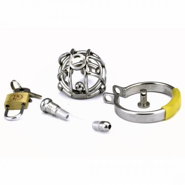 Виготовлений з медичної, що не містить нікелю нержавіючої сталі. Коротка в'язниця для пеніса Stallion Guard з отвором через гнучку паличку принца Альберта ZA130Set включає в себе: 1 клітку, довжина 3,8 см. діаметр близько 30 мм. Всього 5 намистин, 4 намистини можуть бути рухливими, діаметр 10мм, одна з бусинок закріплена в середній частині, діаметром 8мм, може бути вбудована в корпус. 2, кільце. Внутрішній діаметр 45 мм. 3, стопорний штифт. 4, замок з ключем. 5, є катетерна клітина, яка становить близько 65 мм.діаметр труби становить близько 6 мм, на додаток до труби діаметром близько 150 мм її можна розрізати. 6, Вага: 145 г.