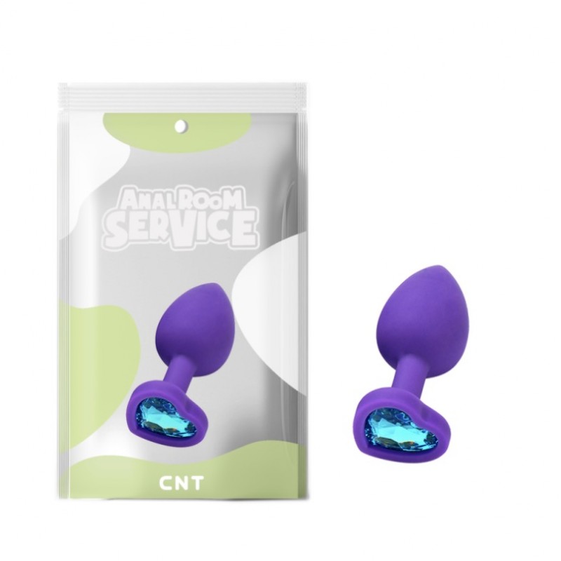 Анальна пробка силіконова фіолетового кольору з блакитним камінцем у формі серця Cnt Love Diamond розмір Small