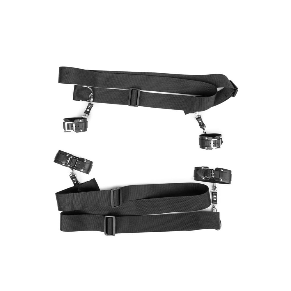 У комплект входять дві нейлонові стрічки, які кріпляться до ліжка та регулюються за параметрами меблів, наручниками та поножами з екошкіри.
