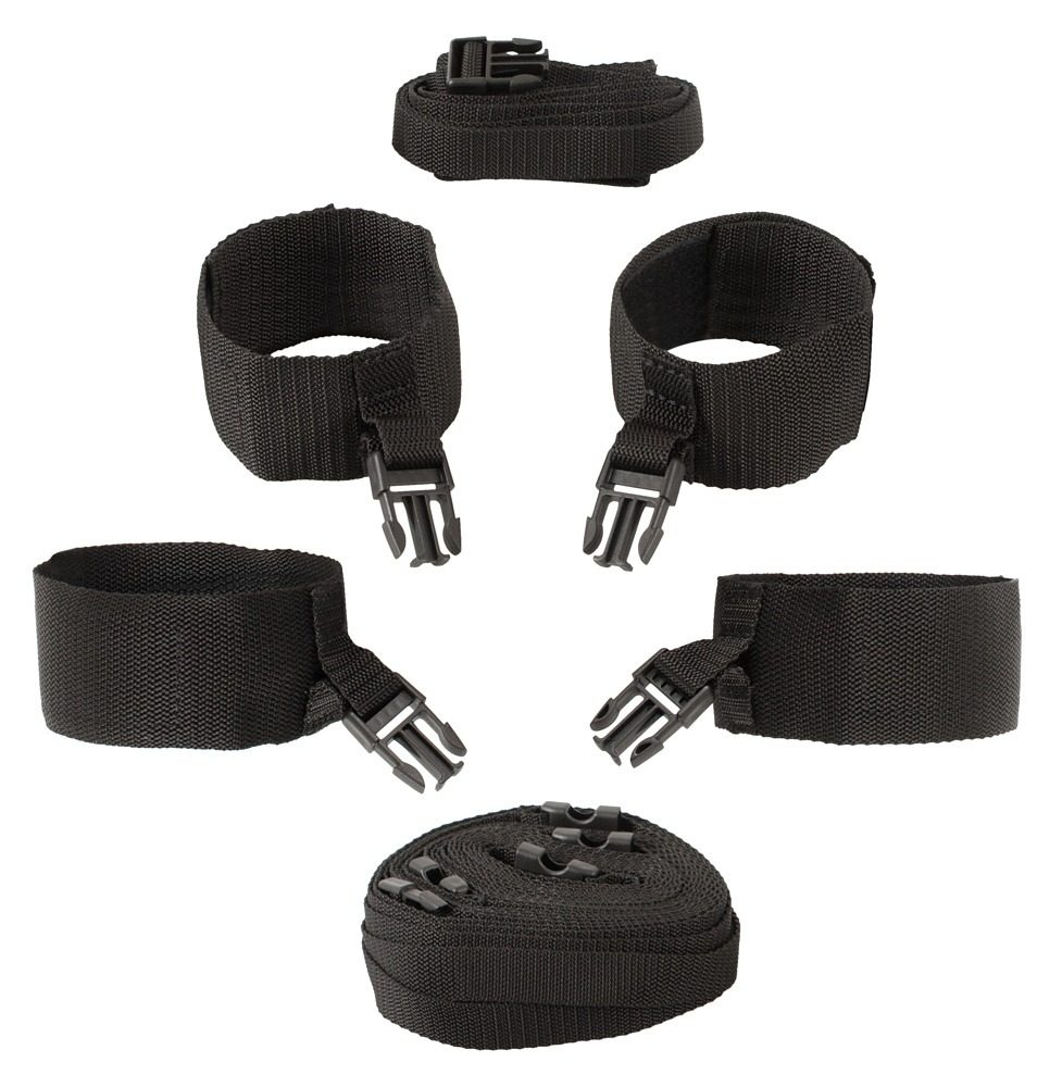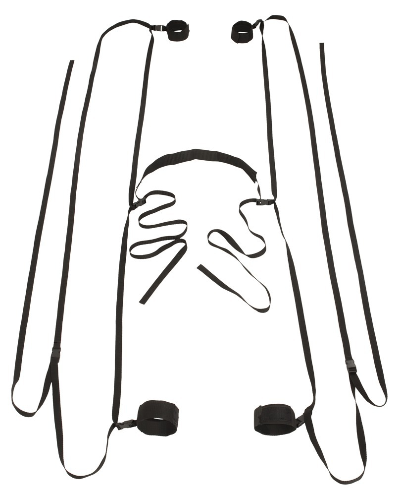 Регульовані міцні ремені підходять для будь-якого матраца або дверей. Регульований поясний ремінь, наручники та манжети на щиколотках можна прикріпити до шести затискачів на двох ременях. Зручні наручники та манжети на щиколотках мають практичні застібки-липучки, що означає, що їх можна носити як ВІН, так і НЕЇ.