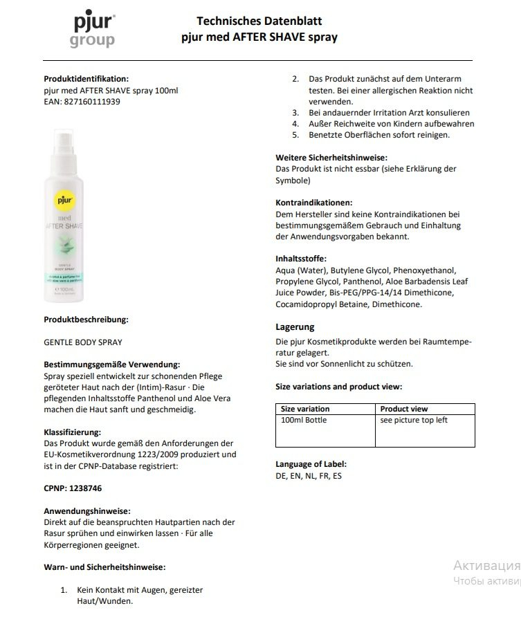 Спрей після гоління Pjur Med був розроблений для вирішення таких проблем. Він не щипає, а заспокоює і живить чутливі ділянки шкіри. Він містить провітамін B5 та алое віра, які допомагають заспокоїти та пом'якшити подразнену шкіру.