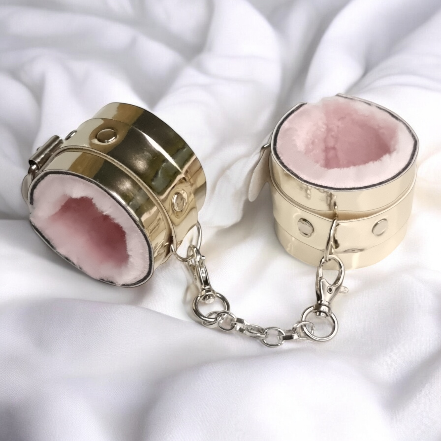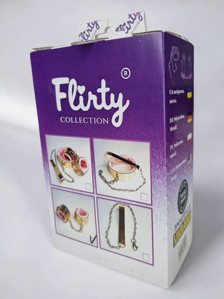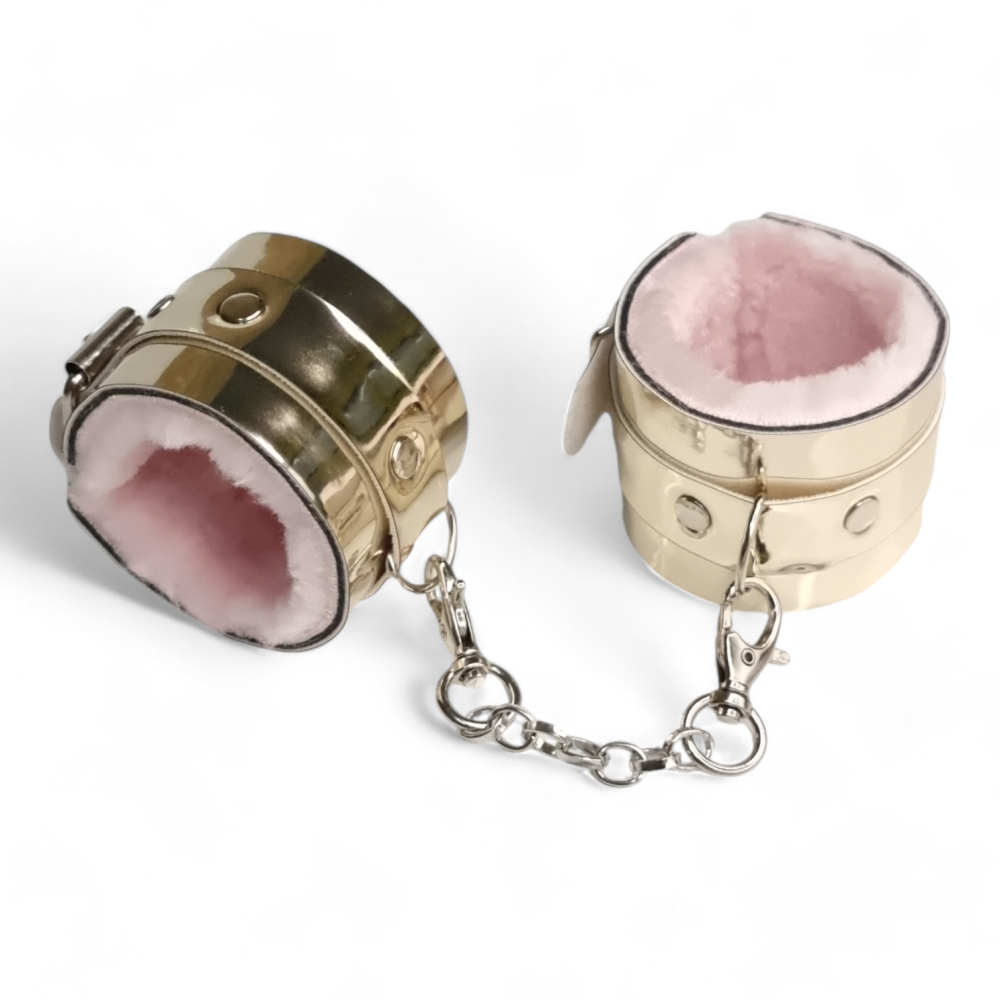 Характеристики Стильні наручники БДСМ із штучної шкіри золотистого кольору з рожевим хутром Flirty