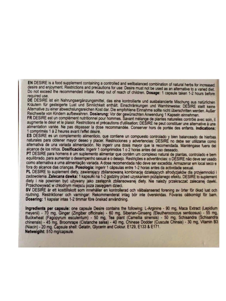 Viamax DESIRE призначений для посилення статевого потягу і сексуального задоволення у жінок. Покращує кровопостачання статевих органів. Тимчасово підвищує рівень гормонів, відповідальних за статеву функцію, покращує настрій і знижує тривожність.