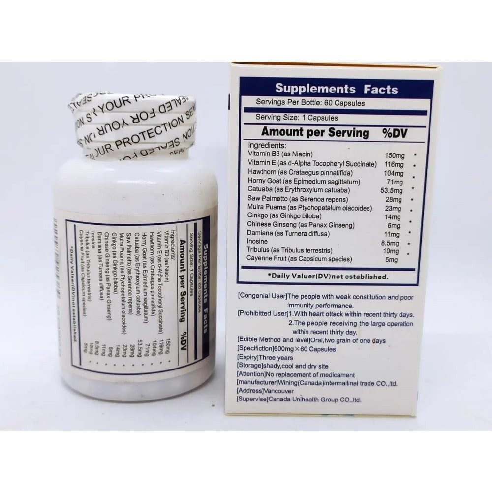 Містить: Вітамін Е Товчене листя Гінкго Білоба Корінь женьшеню Кайєнський перець Екстракт ягід глоду Со Пальметто 45% жирних кислот Екстракт вівсяної соломи 10:1 (Авена сатива) Рисове борошно Не містить: пшеничний глютен, зерно, молоко, натрій, смакові добавки