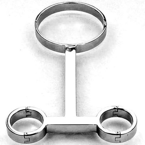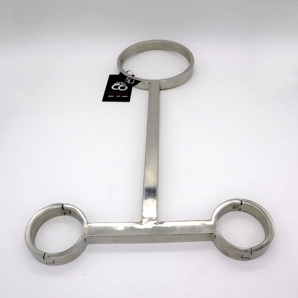 Відрядний фіксатор для шиї і рук з нержавіючої сталі, що дозволяє тривалому використанню. За допомогою нього руки партнера завжди будуть підняті. Додаються замки з трьома гвинтами з нержавіючої сталі і шестигранний ключ. Внутрішній діаметр для шиї 13,2 см, діаметр для зап'ястків 6 см. Загальна довжина приладу 45 см.