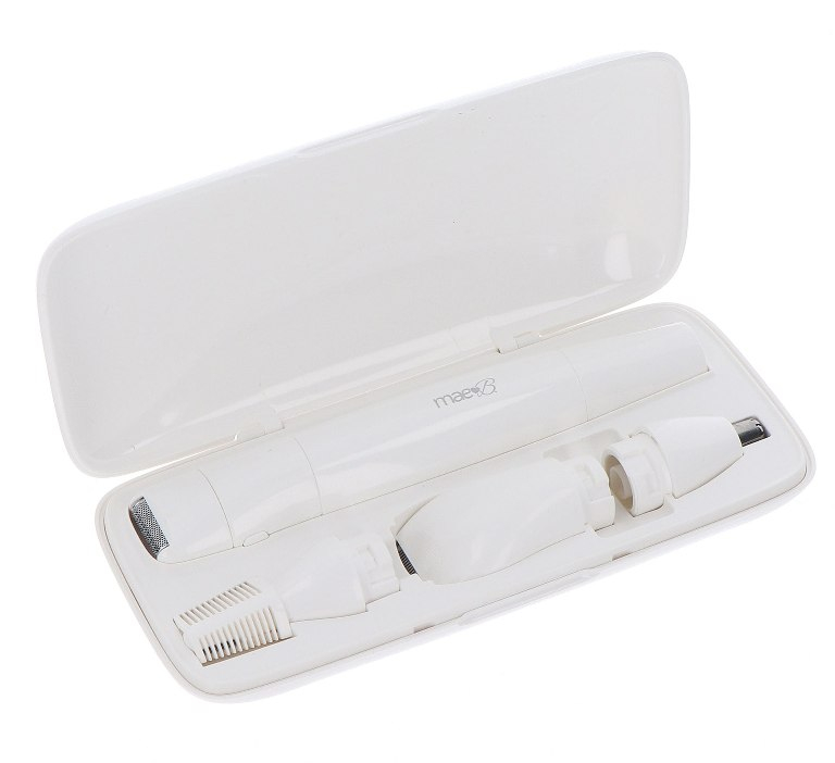 "Все в одному" - точно підстригте волосся на обличчі та тілі за допомогою "Все в одному" від Мей Б. Ергономічна ручка забезпечує оптимальний контроль та комфорт при використанні. Гострі, гіпоалергенні леза з нержавіючої сталі ефективно та безпечно видаляють волосся на обличчі та тілі. Все в одному жіноче бритво включає в себе повний набір з чотирма різними головками підстрижки та шафку для зберігання, щоб зберегти пристрій та аксесуар у безпеці. Специфікації: