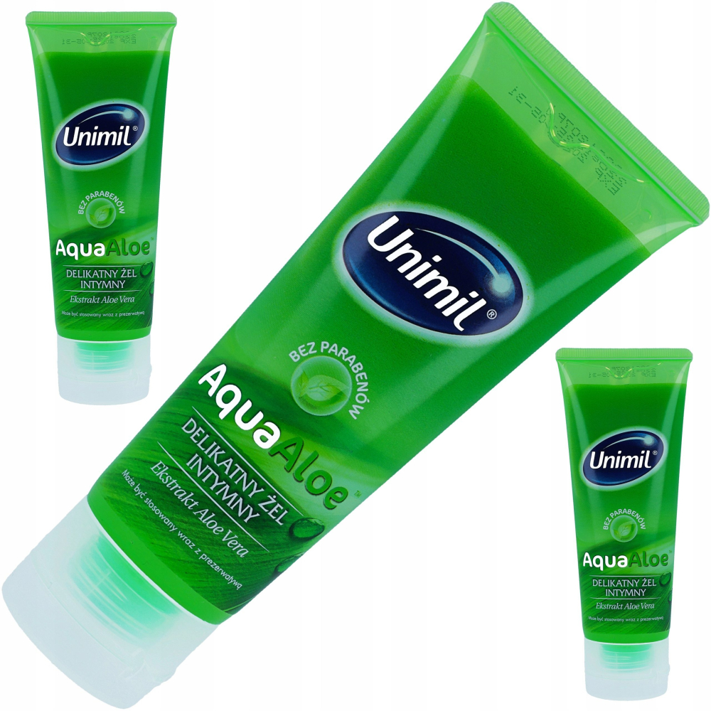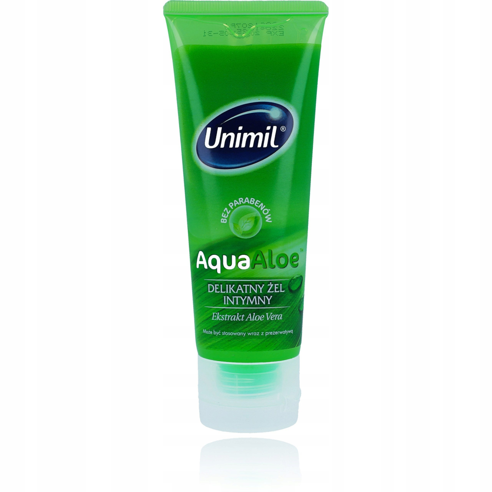 Гель Unimil Aqua Aloe – ніжний гель для інтимної гігієни з м'якою формулою на водній основі з додаванням екстракту алое, що має пом'якшувальні та заспокійливі властивості. Гель забезпечує тривале зволоження та допомагає полегшити почуття дискомфорту, спричинене сухістю піхви. Він водорозчинний, легко змивається і не залишає плям. Його з успіхом можна використовувати з презервативами з поліізопрену, натурального латексу чи поліуретану. Не містить парабенів та ароматизаторів.