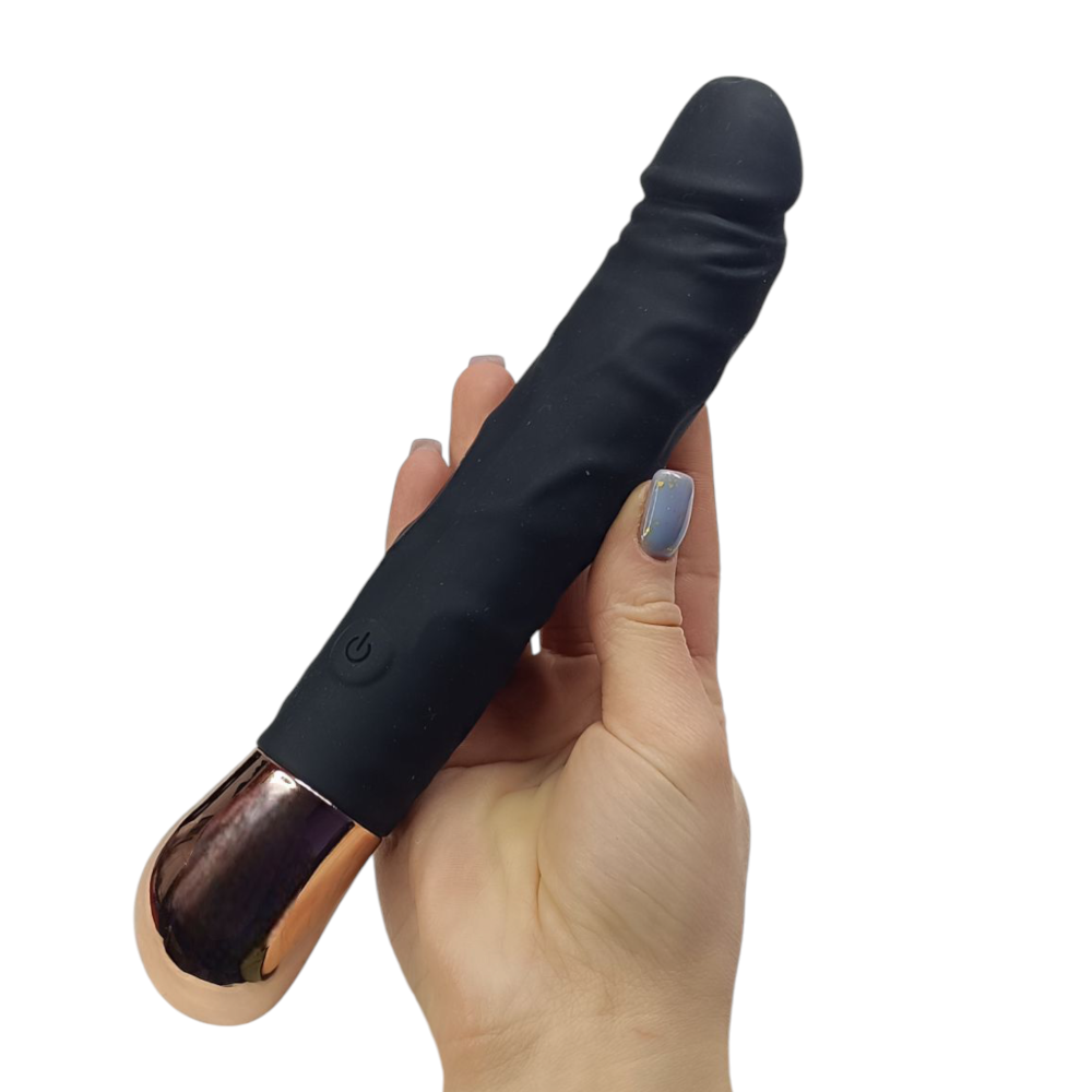 Це й справді пружний ствол! Цей вагінальний вібратор затьмарить розум і надовго віднесе у світ задоволення. Його форма, рельєф, стильний дизайн і потужна вібрація безперечно притягують погляд і пробуджують інтерес до нових експериментів у ліжку. Корпус іграшки покритий гіпоалергенним силіконом чорного кольору. Він точно повторює форму пеніса з виразною головкою та вінками по стовбуру. Вигнута пружна головка відходить не тільки для вагінальної стимуляції, але і для масажу точки g. Керується завдяки одній кнопці. Для включення затисніть кнопку на корпусі іграшки на 3 секунди, вібрація миттєво запрацює, клацніть на кнопку вибираючи потрібний режим із 10 наявних. Щоб вимкнути, натисніть цю кнопку на 3 секунди. Вібромасажер перезаряджається через USB зарядку, яка йде в комплекті. Роз'єм під зарядку акумулятора ховається під золотистою кришкою рукоятки, яку потрібно відкрутити, перш ніж вставити шнур. Кришка не тільки ховає USB вхід, а й робить даний вібромасажер водонепроникним та безпечним для використання у воді. Використовуйте лише з лубрикантом на водній основі. Матеріал силікон Колір чорний Загальна довжина 250 мм Робоча довжина 160 мм Діаметр 35 мм Вібрація 10 режимів Заряджання USB в комплекті Упаковка коробка