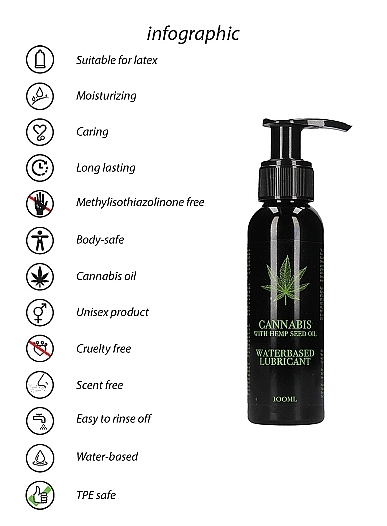 Мастило на водній основі Cannabis With Hemp Seed Oil-Waterbased Lubricant густий лубрикант на водній основі. Додавання екстракту КБР забезпечує краще поглинання шкірою і дає краще ковзання