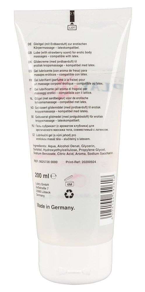 Веганський гель на водній основі. З спокусливим ароматом полуниці для годин чуттєвого задоволення. Без масла і нежирного. Сумісний з латексом.