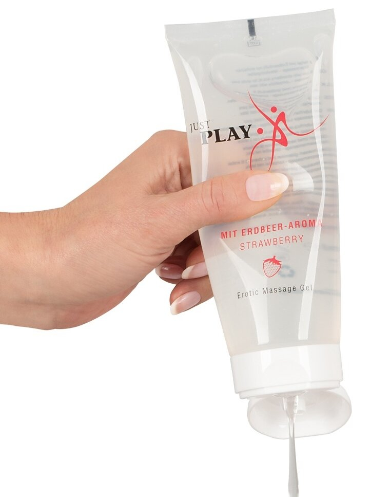 * Масажний гель для еротичного масажу тіла - Just Play Strawberry підходить для чуттєвого і еротичного масажу всього тіла. Однак це не проблема, якщо все стане трохи складніше, тому що масажний гель сумісний з латексом.