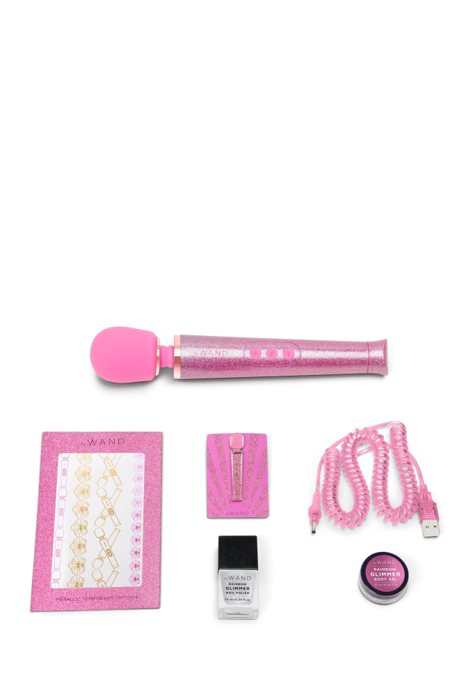 У комплект All That Glimmers Special Edition Le Wand Petite входить путівник із задоволенням, відповідний блискучий, але стриманий дорожній футляр, мікрофон, щоб продемонструвати свою гордість за задоволення, а також набір лаку для нігтів Rainbow Glimmer та гелю для тіла