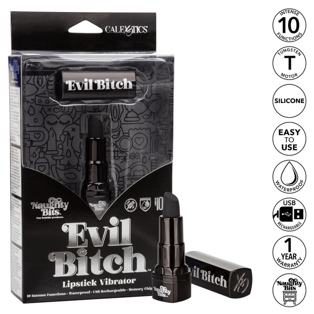 Обережно, вібратор для губної помади Naughty Bits Evil Bitch - бешкетний і приємний. Зухвалий дизайн у вигляді чорної помади, 10 потужних функцій вібрації та безшумний вольфрамовий двигун створені для того, щоб тішити вас, куди б ви не подалися.