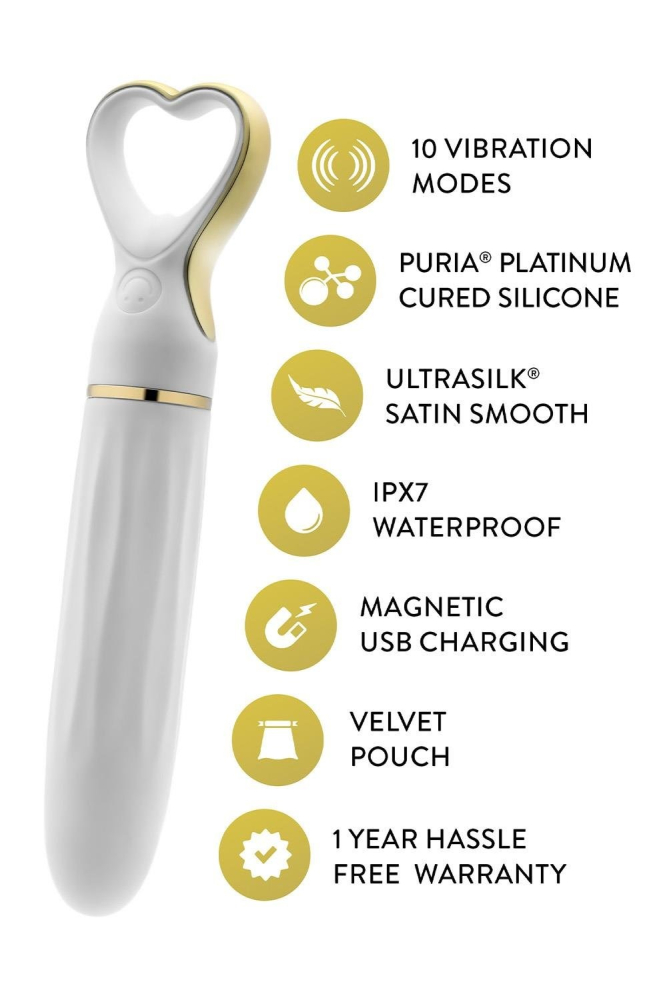 Heartthrob має 10 режимів вібрації, з яких 5 швидкостей і 5 патернів, щоб ви могли повністю віддатися насолоді та експериментувати з різними варіантами стимуляції. Виготовлений з преміум матеріалу Puria платиново-відпалений силікон, він дарує неймовірно м'яке та ніжне відчуття на шкірі завдяки розкішному покриттю UltraSilk. Ергономічна ручка у вигляді серця із золотистими акцентами додає елегантності та стилю.