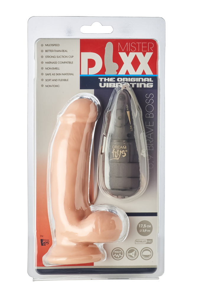 Фалоімітатор Brave Boss має довжину 6,9 дюйма / 17,5 см. Кожен вібраційний фалоімітатор Mr Dixx виготовлений з антибактеріального ПВХ, не містить фталатів та латексу, не має запаху та безпечний для тіла. Для вібрації пульта потрібні 2 батареї ААА (не входять в комплект).