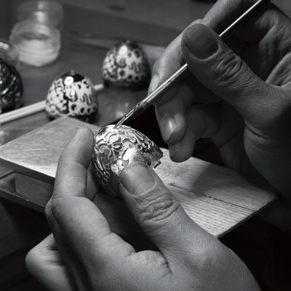 Ювелірний виріб з емалі з 65 обробками вручну і позолотою на металевій поверхні.