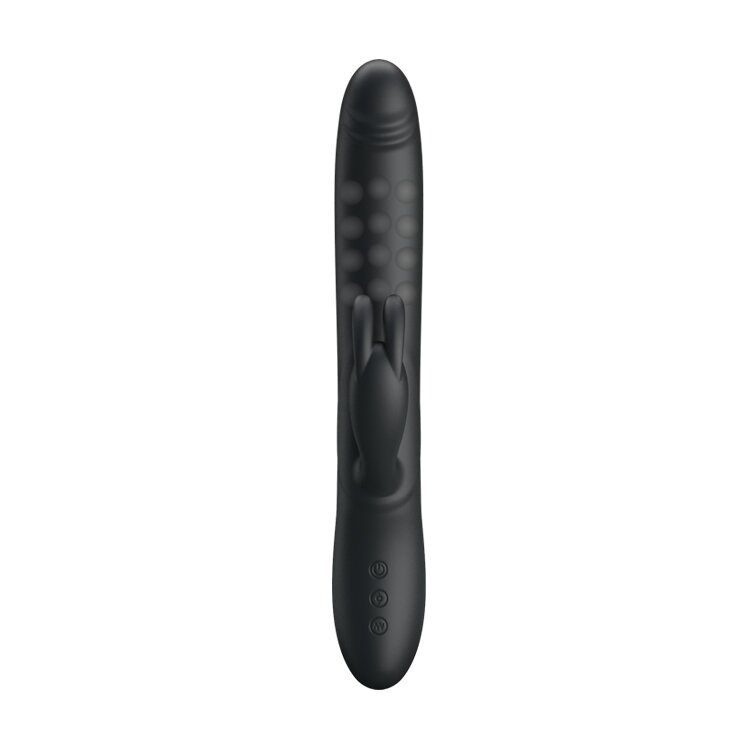 Чорний вібратор з функціями обертання стовбура і потужним кліторальним стимулятором у формі зайчика з 7 режимами вібрації і 4 режимами ротації (регулюються кнопками на підставі).