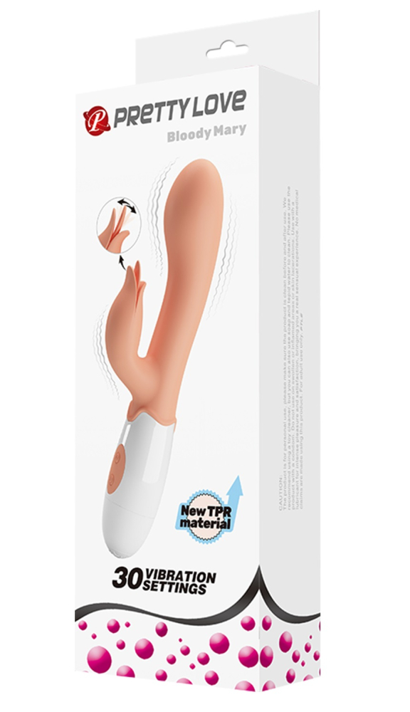 Новий вібратор Bloody Mary від Pretty Love забезпечує потужну стимуляцію вашої піхви та клітора за допомогою стимулятора клітора у формі квіточки. Кліторальний стимулятор додає почуттів під час використання. Вагінальна частина масажера досить тверда з трохи збільшеною вигнутою головкою для впливу на точку G. Вібратор оснащений двома потужними двигунами. Він має 30 захоплюючих режимів вібрації і потребує лише двох батарей AAA. Інтим-іграшка цієї моделі має вбудований основу пульт управління, за допомогою якого дівчина може вибрати найбільш приємний для себе варіант вібрації. Стильний та функціональний вібратор стане чудовим коханцем у ліжку будь-якої жінки та подарує багато чарівних відчуттів!